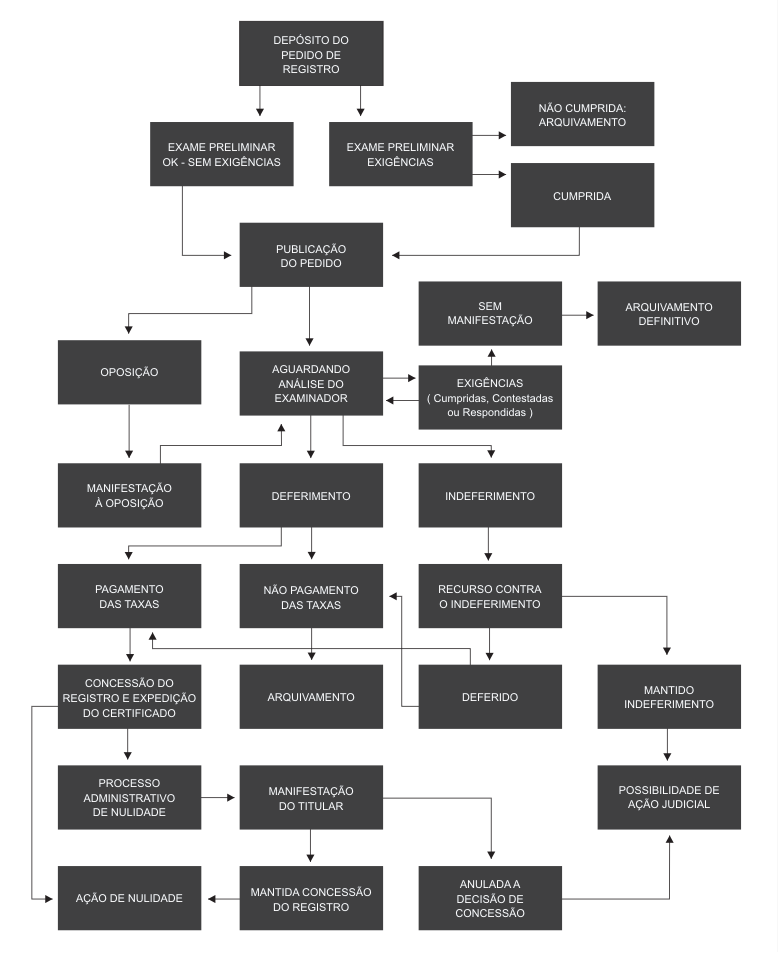 Após o depósito (protocolo) do pedido da marca junto ao INPI, o mesmo será publicado na RPI (Revista da Propriedade Industrial), no prazo aproximado de seis meses. A partir desta data, terceiros tem um prazo de 30 a 60 dias para se opor. Caso isso ocorra, o titular será notificado através da RPI, e também terá sessenta dias para enviar sua defesa. Ultrapassada essa fase, o pedido aguardará o exame técnico, que resultará em uma decisão sobre a registrabilidade da marca.